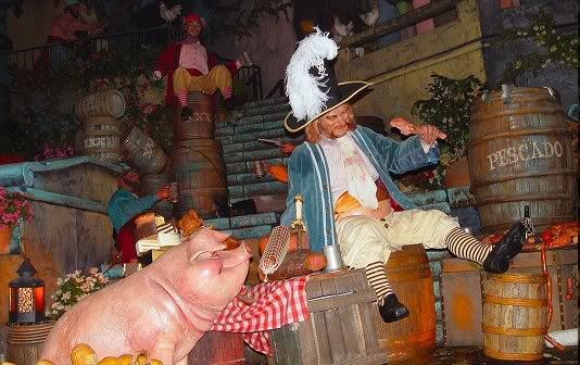 As the bateaux float into what used to be called the Chase Scene but was re-titled the "Gluttony Scene" for the '97 rehab, riders will notice the chase is back on and the food is gone. The additional animatronics from Epcot's old World of Motion ride that were added in '97 have been removed, and a couple of the original turntables with pirates chasing the girls have been put back in. Some of the girls will be carrying treasure and jewels as they run from the pirates but the contrived "pirates are hungry" plotline from ‘97 has mercifully been scrapped. Depp shows up again in this scene, popping up out of the barrel in place ofthe unfunny cat that had been there since '97, as the pooped pirate in front of him talks of the hidden treasure.