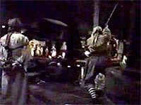 As the boats float past the Treasure Scene and into the dark cavern that leads to main part of the ride, the fun really begins as a new projection effect appears on a "mist curtain" above the boats. (Kinda like the rats in "Indiana Jones") Davy Jones appears in the mist, looking just as he will in the upcoming movies as a true pirate's pirate with a beard made of wiggling octopus tentacles.
